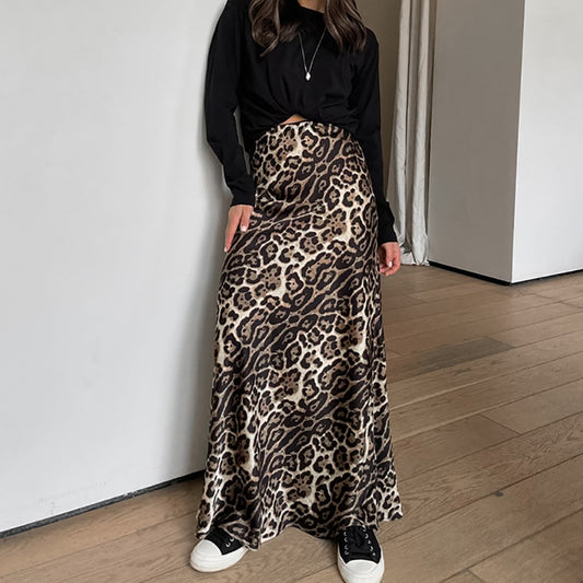 Women's Vintage Satin Sexy Leopard Print Casual Midi Skirt