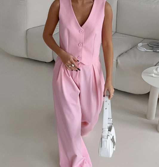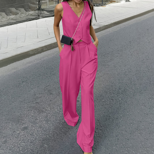Women's Summer Simple and Stylish Sleeveless V-Neck Vest and Wide-Leg Pants Set