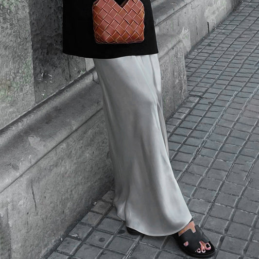 Elegant Gray Satin High Waist Mermaid Maxi Skirt