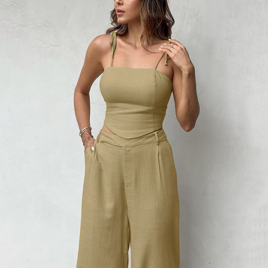 Women's Summer Casual Solid Color Spaghetti Strap Crop Top and Long Pants Set