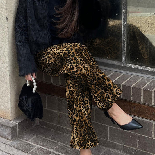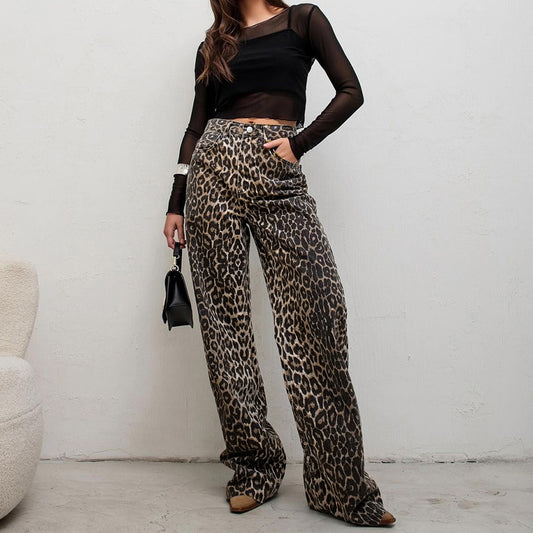 Trendy and Bold Streetwear Style High Waist Leopard Print Straight Pants