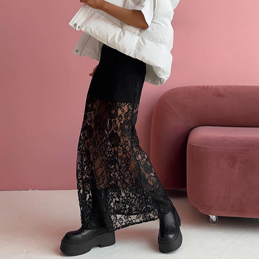 Women's Summer Black Lace Sheer Straight Long Skirt