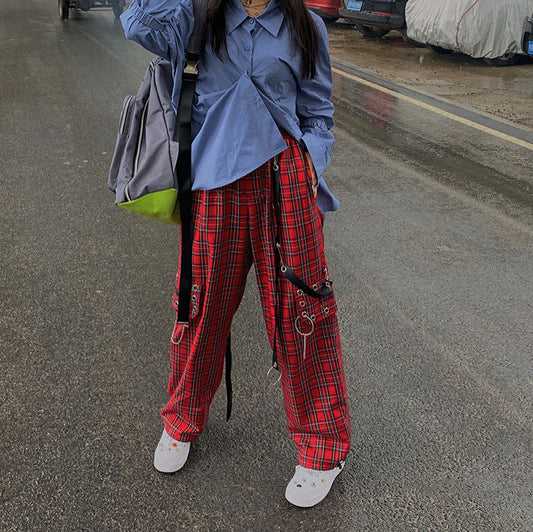 Punk Style Red Plaid Cargo Pants with Loose Fit and Slimming Metal Chain Decoration