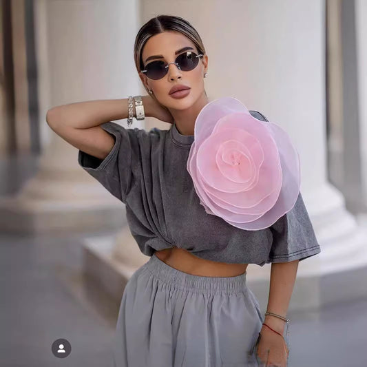 Faded Washed Vintage Cotton Short-Sleeve T-Shirt with Oversized 3D Floral Embellishment