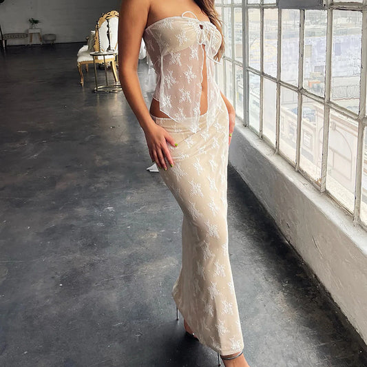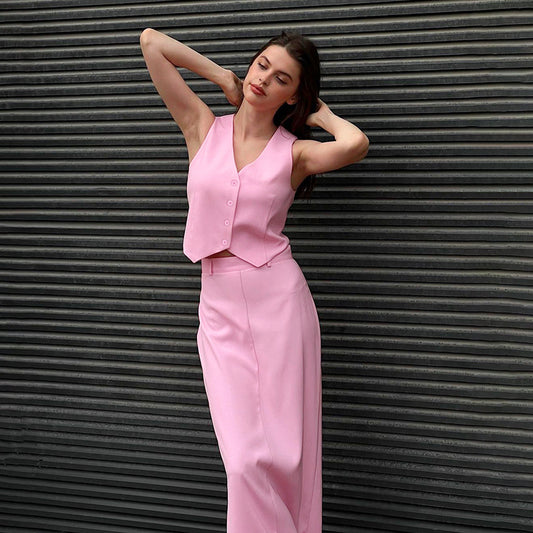 Fashion Casual Pink Two-Piece Set Sexy Sleeveless Vest Crop Top and Mid-Rise Split Skirt