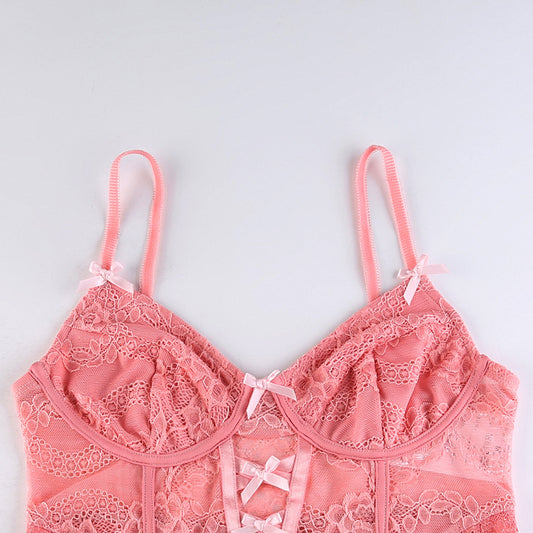 Vintage Lace Backless Printed Lace Bow Slip Dress