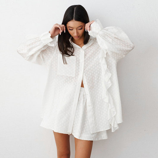 Summer Cotton Ruffle Long Sleeve Shirt and Shorts Set, Women's Loungewear Outerwear Two-Piece