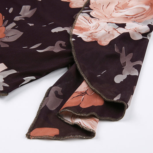 Withered Rose Print Off-neck Pleated Open-back Dress