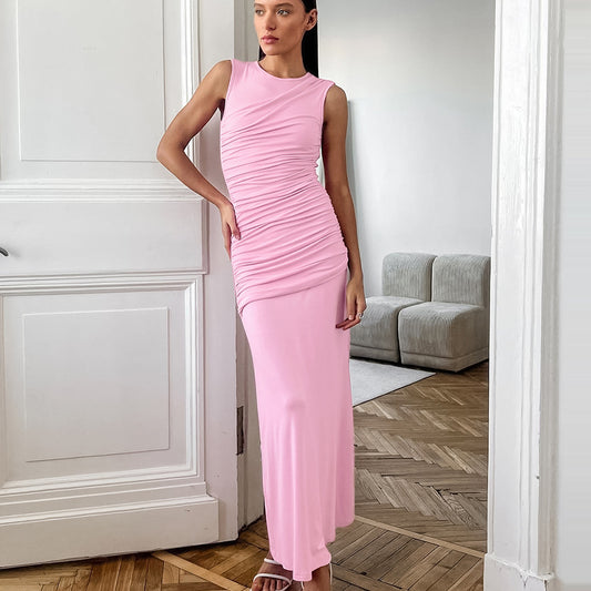 Women's Pink Knitted Sleeveless Ruched Fishtail Loose Dress