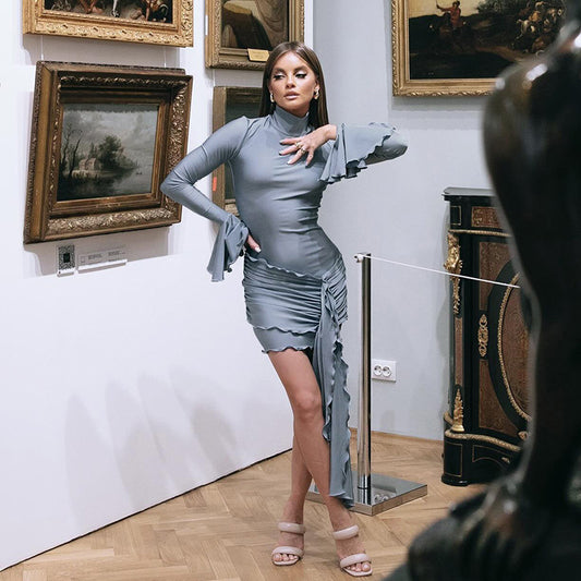 Women's Fashion Solid Color High Neck Flare Sleeve Dress