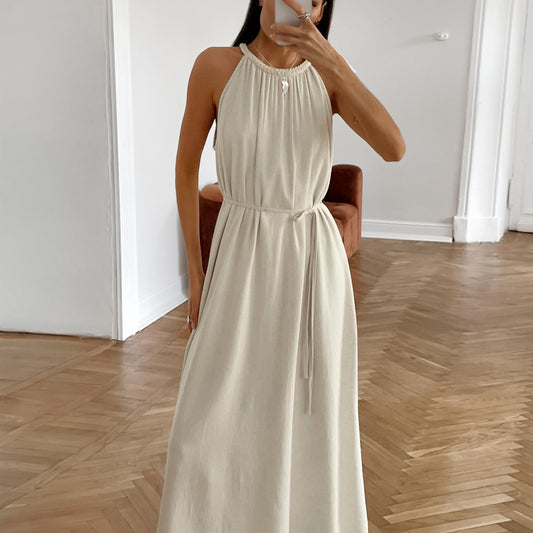 Women's Khaki Cotton-Linen Sleeveless Halter Neck High Waist A-Line Dress