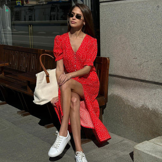 Women's Summer V-Neck Waist Slimming Split Midi Red Polka Dot Short Sleeve Dress