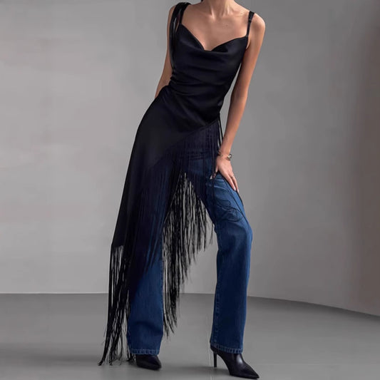 Black Satin Asymmetrical Fringe Overlay Dress – Bold Layered Statement for Women