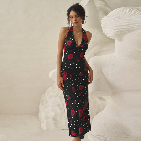 Summer Halter Neck Deep V Backless Floral Maxi Dress