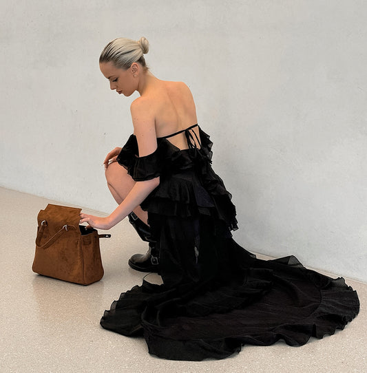 Off-Shoulder Ruffle High-Slit Asymmetrical Dress