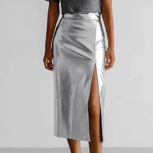 Silver Faux Leather Futuristic High-Waist Slit Bodycon Skirt