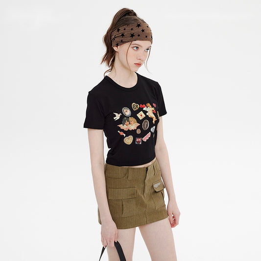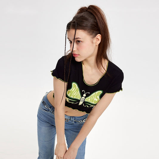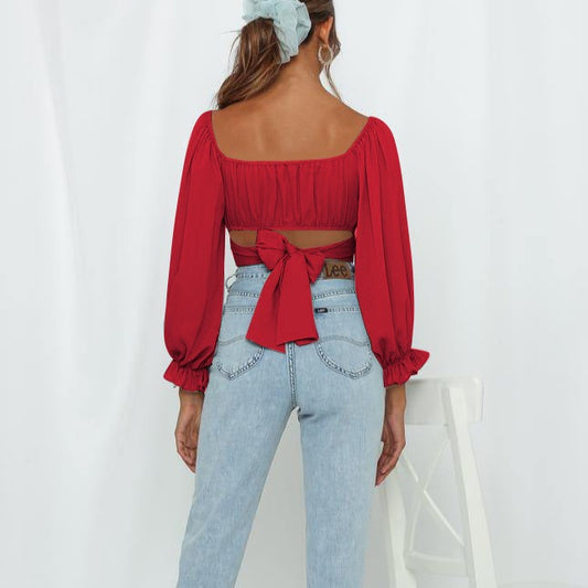 Satin Cropped Puff Sleeve Top with Feather Cuffs