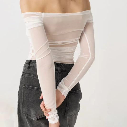 Summer Women's Fashion Off-Shoulder Sheer Mesh Ruched Top