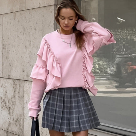 Women's Pink Loose Ruffle Long-Sleeve Sweatshirt