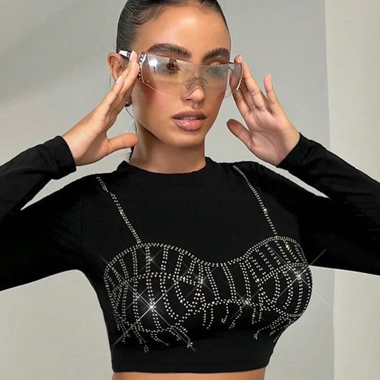 Women's Round Neck Long Sleeve Cropped Rhinestone Printed Top