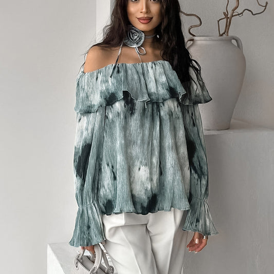 Women's Casual Printed Off-Shoulder Tie Loose Bell Sleeve Blouse with Floral Necklace