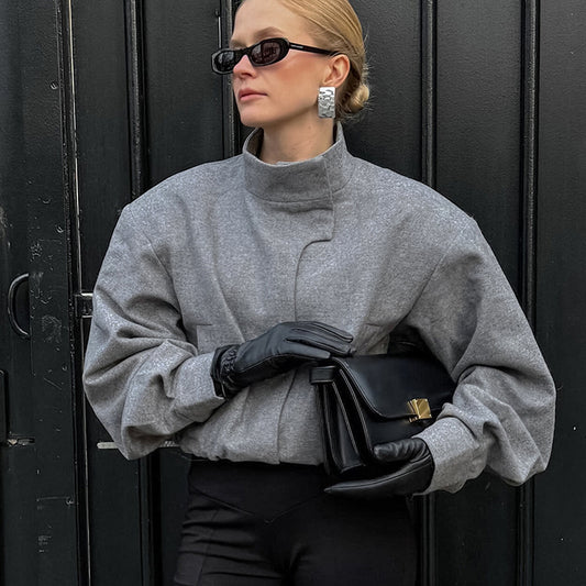 Women's New Gray Stand Collar Short Loose Woolen Coat