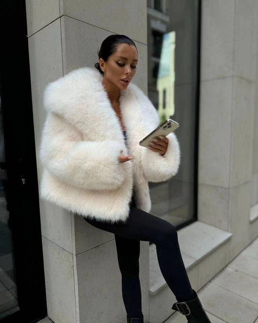 Women's Oversized Environmentally friendly Faux Fox Fur Coat with Large Lapel