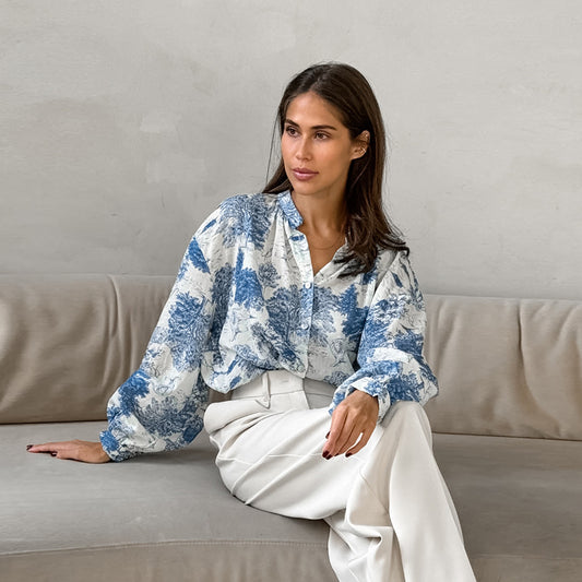 Women's Fashion Stand Collar Long Sleeve Loose Blue Print Shirt