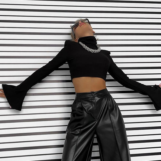 Black Fashion Cowl Neck Bell Sleeve Crop Top