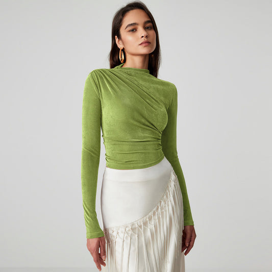 Women's Autumn Winter Velvet Ruched Long Sleeve Pullover Mock Neck Top