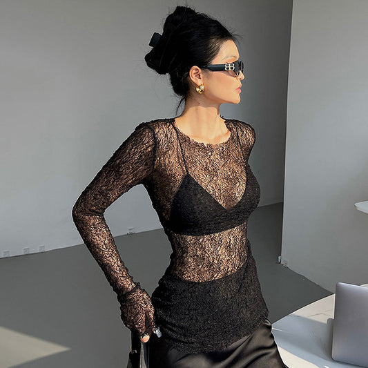 Sexy Sheer Crew Neck Slim Fit Solid Long Sleeve Top