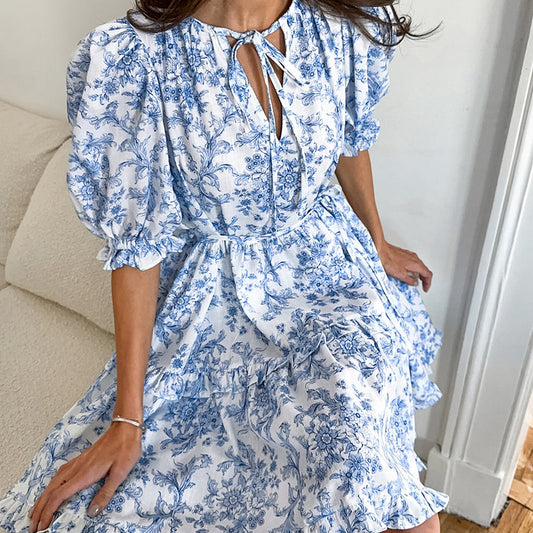 Women's Summer French Style A-Line Puff Sleeve Floral High Waist Tie Dress