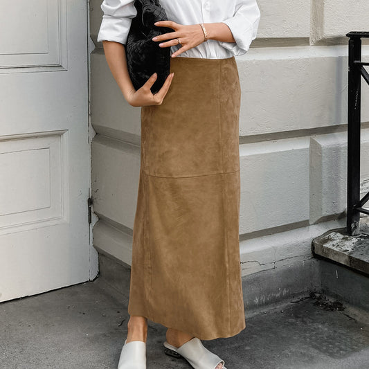 Women's Retro Fashion Knitted Suede Khaki Slim High-Waisted Straight Skirt