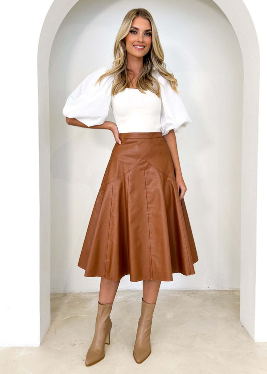Women's High-Waisted Mid-Length Pleated Leather Skirt