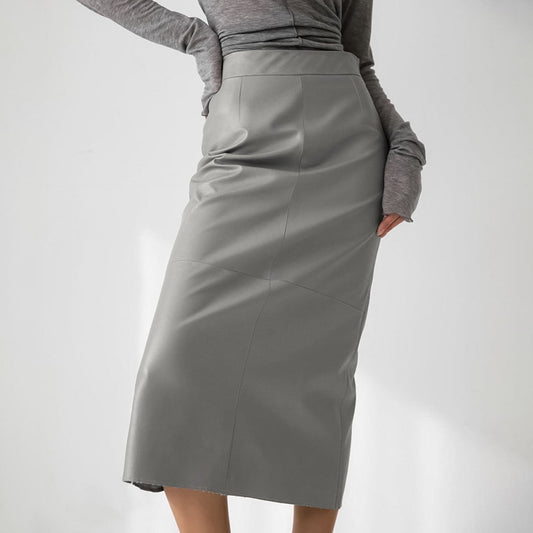 Women's Sexy High-Waisted Leather Midi Skirt with Front Slit and Zipper Closure