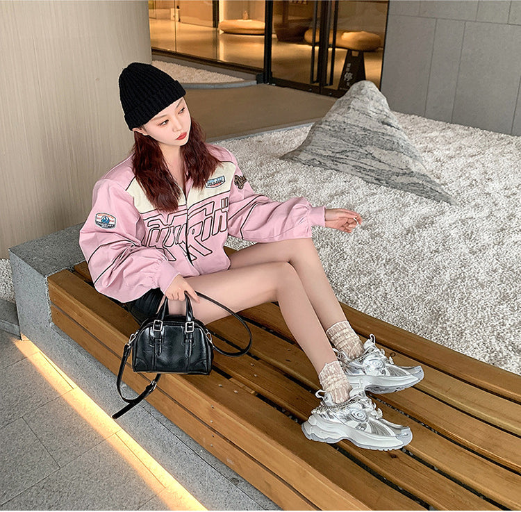 Elevate your style with our Lace Silver Chunky Sneakers for Women. These 2024 fashion-forward shoes feature a unique blend of lace, silver, and pearls, creating a stunning look. Crafted from premium fiber, mesh, and knitted fabric, they offer both durability and breathability. The soft and comfortable fabric lining ensures all-day comfort, while the cotton lace design adds a touch of elegance. With a 5cm chunky rubber sole providing stability and traction, these sneakers are perfect for daily wear, school, or vacation outings. Step into the future of fashion with these trendy lace-up sneakers.
