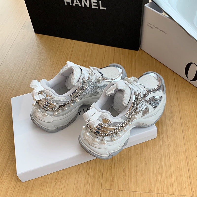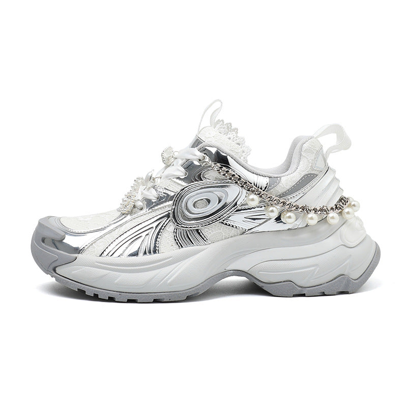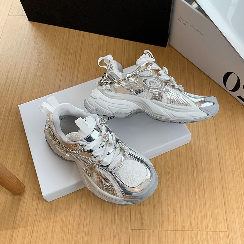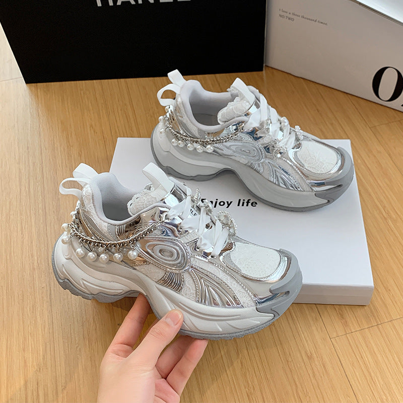 Lace Silver Chunky Sneakers for Women - 2024 New Fashion Pearl Mesh Lace-Up Turbine Casual Shoes